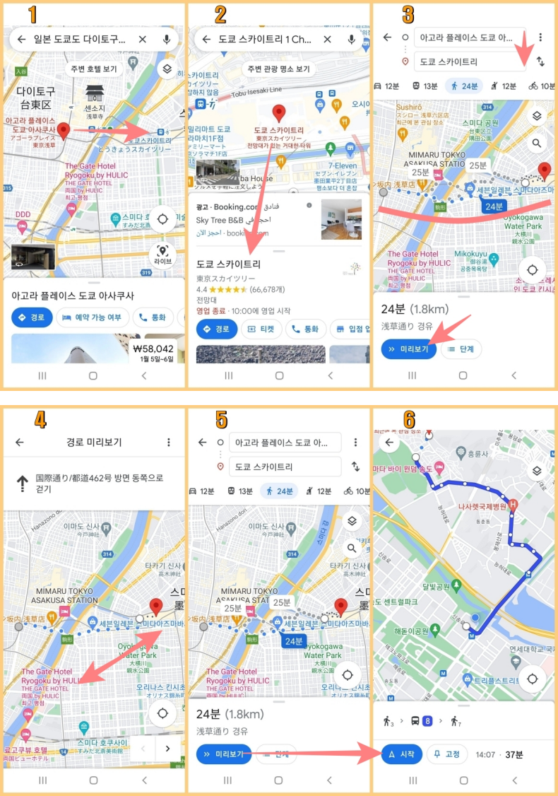 구글 지도 앱으로 아사쿠사 숙소인 '아고라 플레이스'에서 '도쿄 스카이트리' 도보로 가기 방법과 순서입니다.