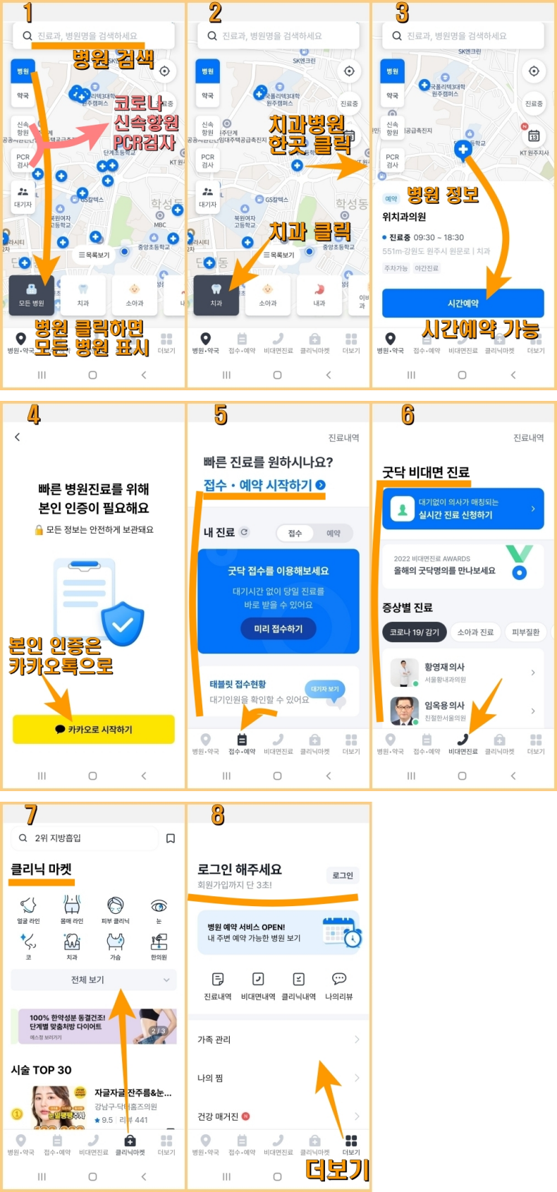 치과, 소아과, 내과, 이비인후과, 피부과, 산부인과, 안과, 정신의학과의 검색과 예약이 가능하며,
