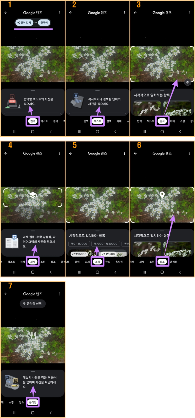 '번역, 텍스트, 검색, 과제, 쇼핑, 장소, 음식점' 사용방법에 대한 설명입니다.